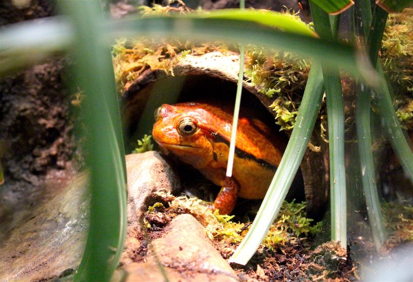 Visitors can stroll through the elaborate displays pretending they are on an expedition, trying to find all the extraordinary critters in the exhibit, which includes 15 different species from around the world. Some, like the radiant blue poison dart frog, jump right out at you, while others can take quite a bit of searching to discover.