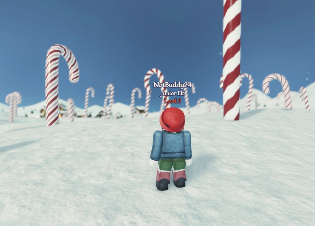 The first thing that hits you when you jump into the perpetually snow-covered world of Elf (North Pole Workshop) is that it looks a little different from other Roblox games. According to Chris, the art and animation style for this world is based on Rankin/Bass creations. Everything has its own texture. It looks like the characters and objects are constructed out of craft materials, such as felt, just like you remember from watching holiday favorites, such as Rudolph the Red-Nosed Reindeer or Frosty the Snowman. New Line Cinema’s Elf also borrowed heavily from this art style in its animated scenes.