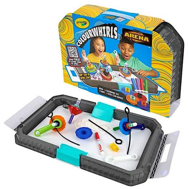 However, when you are ready to step up your game and turn your artwork into a head-to-head competition, Crayola has got you covered. The Crayola Colourwhirls Arena Set comes with a battle arena, four Crayola Colourwhirls, four Ultra-Clean Washable Markers, four 2-in-1 handles, four ripcords, four marker adapters, design stickers, and more. In short, the set comes with everything you need to have a four-player battle royale for the king or queen of creativity.